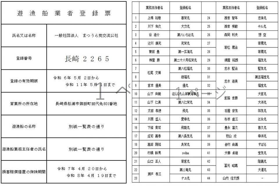 この度令和6年度4月1日付施行の遊漁船業法(遊漁船の適正化に関する法律)の改正により、弊社が運営する「ほんなもん体験」におきましても、遊漁船業者登録票のHP記載の義務が適応されることから、弊社に所属している遊漁船の一覧表を掲示しております。